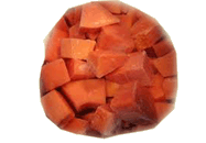 These are made from selected varieties of Papaya. Fully matured Papaya fruits are harvested, quickly transported to our IQF processing plant, inspected and washed. Selected, high quality fruits go to the controlled ripening chambers. Fully Ripened Papaya fruits are then washed, peeled manually, deseeded, sanitized, diced at different sizes like 6x6 mm, 10x10 mm, 20x20mm, frozen and packed under strict hygienic conditions.